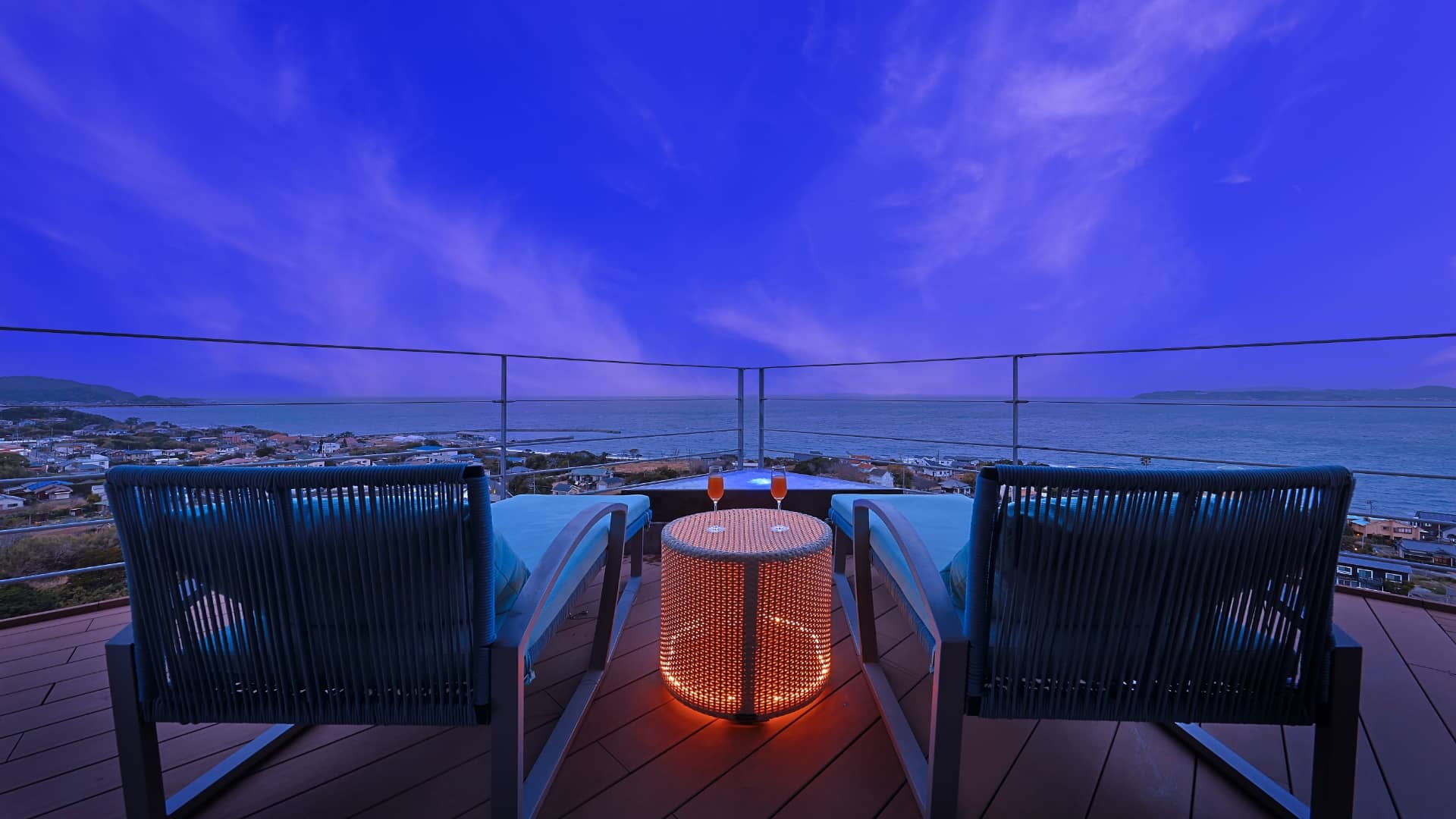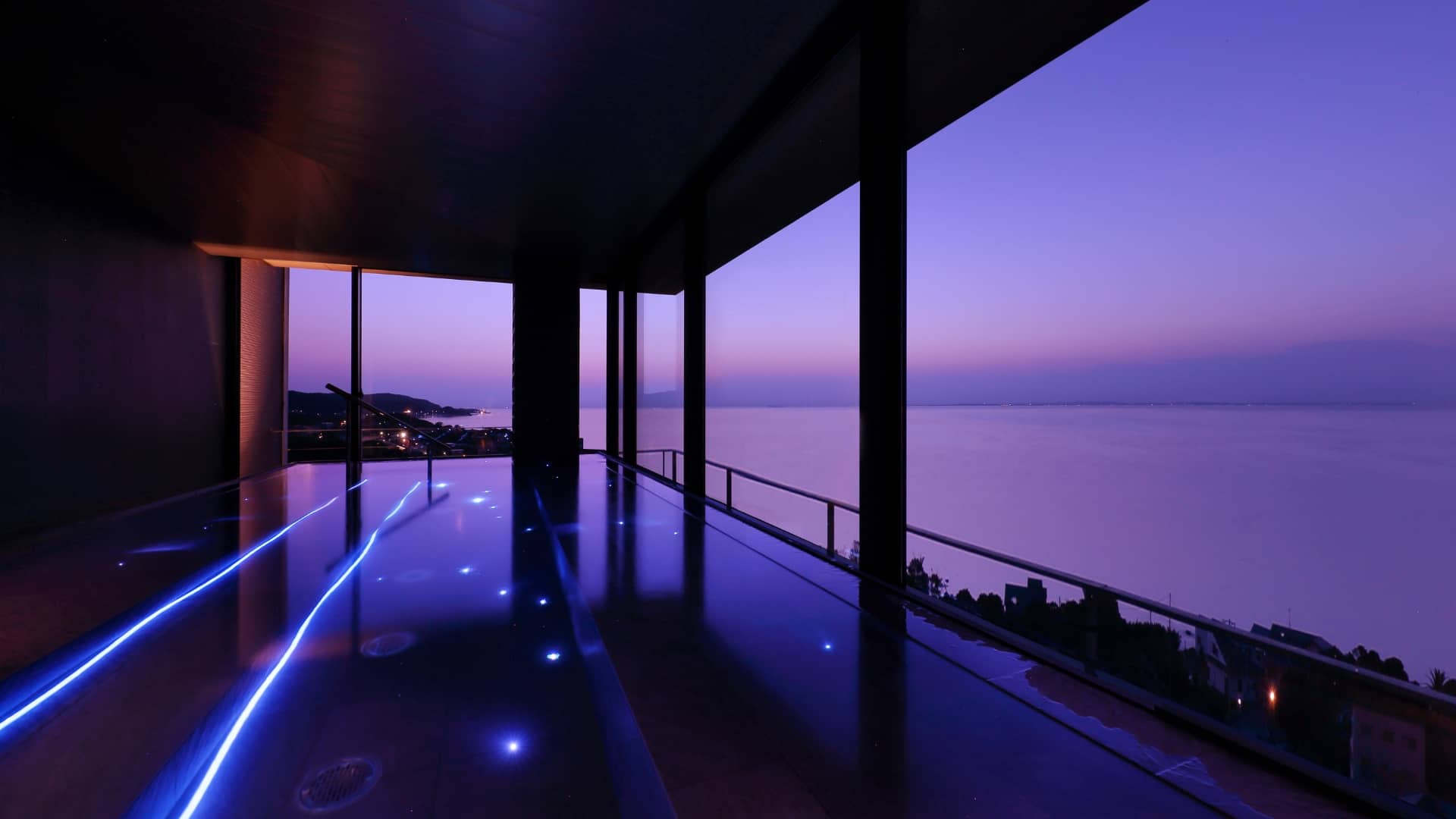 視界を遮るものがない、海抜50mのパノラマビュー。湯舟が床全体を覆うように設計されたユニークな展望風呂の湯面には、窓の外に広がる空の色彩が鏡のように映り込み、空間全体をさらに幻想的に演出してくれます。刻一刻と姿を変えていく大自然のパノラマに魅了されながら、至福の温泉時間をお楽しみください。
